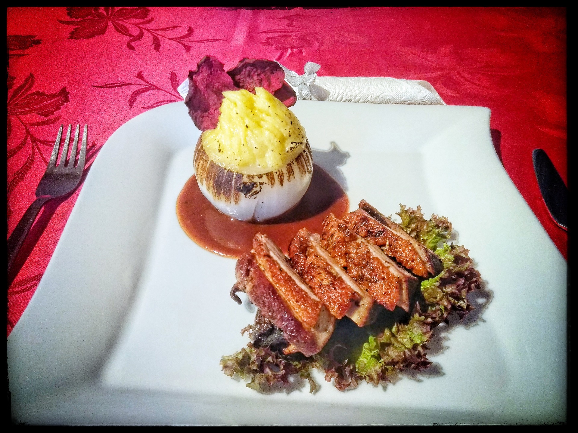 Kachní prso si orestujeme kůži dolů na pánvi (neotáčíme) a dáme dodělat na 5min do trouby na 150°C. V rendlíku si ohřejeme demi-glace, do kterého nalijeme malinový ocet (zbytek co nepojmuli švestky). Servírujeme demi, cibule s pyré, lístek salátu a nafilírované kachní prso. Cibuli si nakonec opečeme flambovací pistolí.